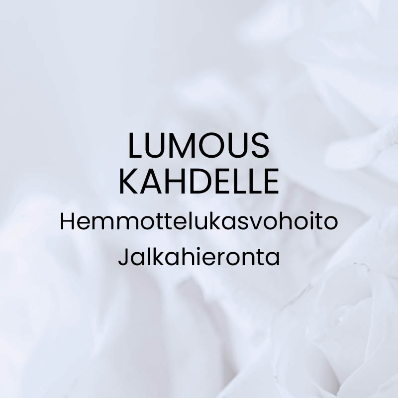 LUMOUS -hemmottelupakettiin sisältyy hemmottelukasvohoito ja jalkahieronta. Hoitopaketin kesto on noin 90 min.