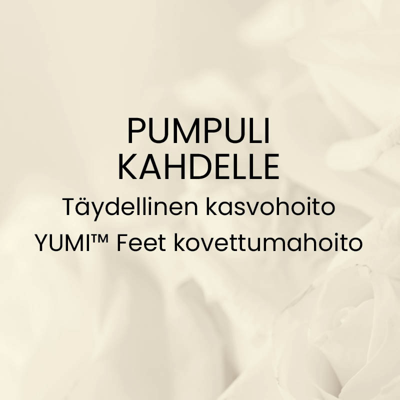PUMPULI -hemmottelupakettiin sisältyy täydellinen kasvohoito ja YUMI™ Feet -kovettumahoito. Hoitopaketin kesto on noin 1 h 45 min.